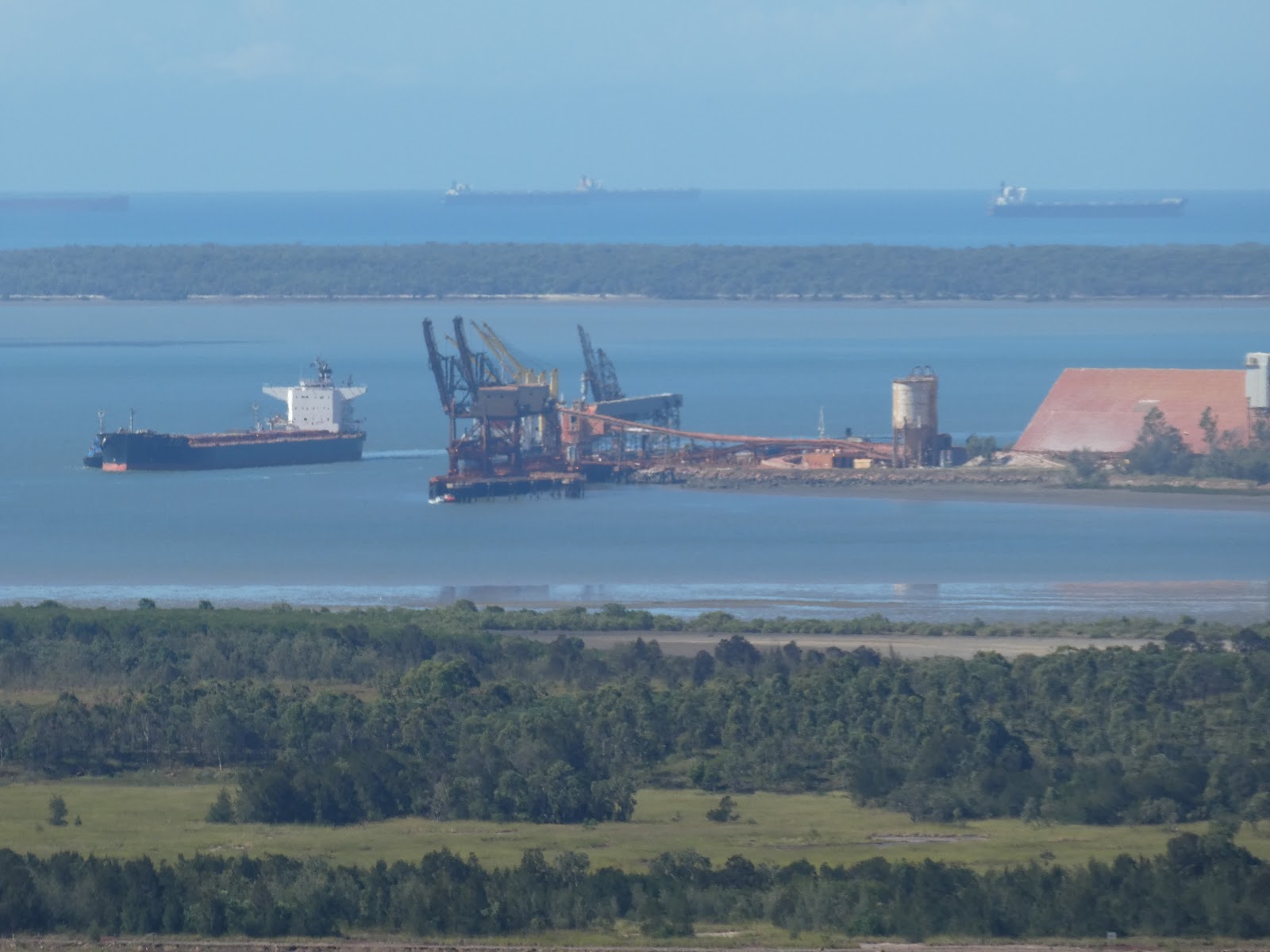 And, if you look closely at this photo, which from the elevated position I took it allowed us to peer over Facing Island out to the Coral Sea beyond (probably twenty kilometres distant), you will just be able to make out a number of bulk carriers lying in the roads awaiting their entry orders.