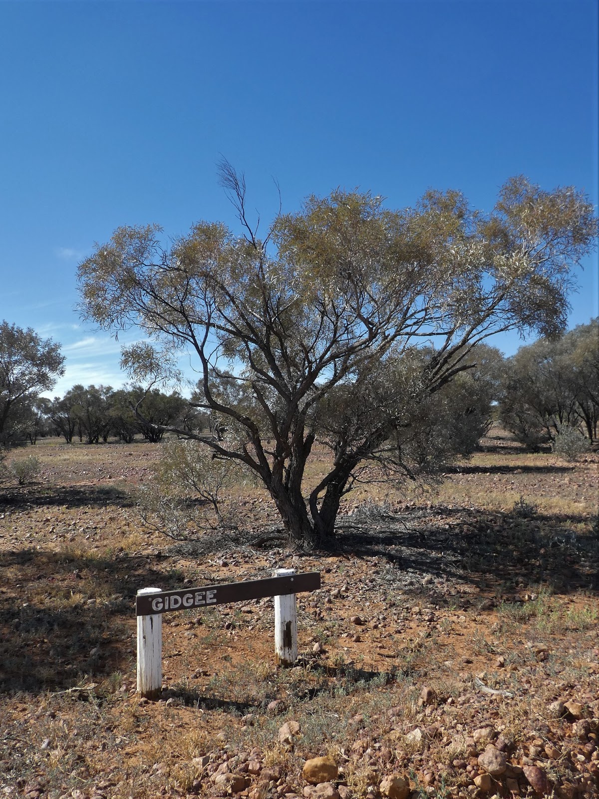 The Gidgee tree is reckoned to have the third hardest wood in the world. We know from previous experience that it burns hotly with little ash and is much valued as a camp fire timber. Unfortunately the leaves and bark, particularly those gathered around the base of the tree, give off a less than pleasant smell, reminiscent of boiled cabbage or sewerage. It is little wonder that it is known universally amongst those in the bush as the 'stinking wattle'.