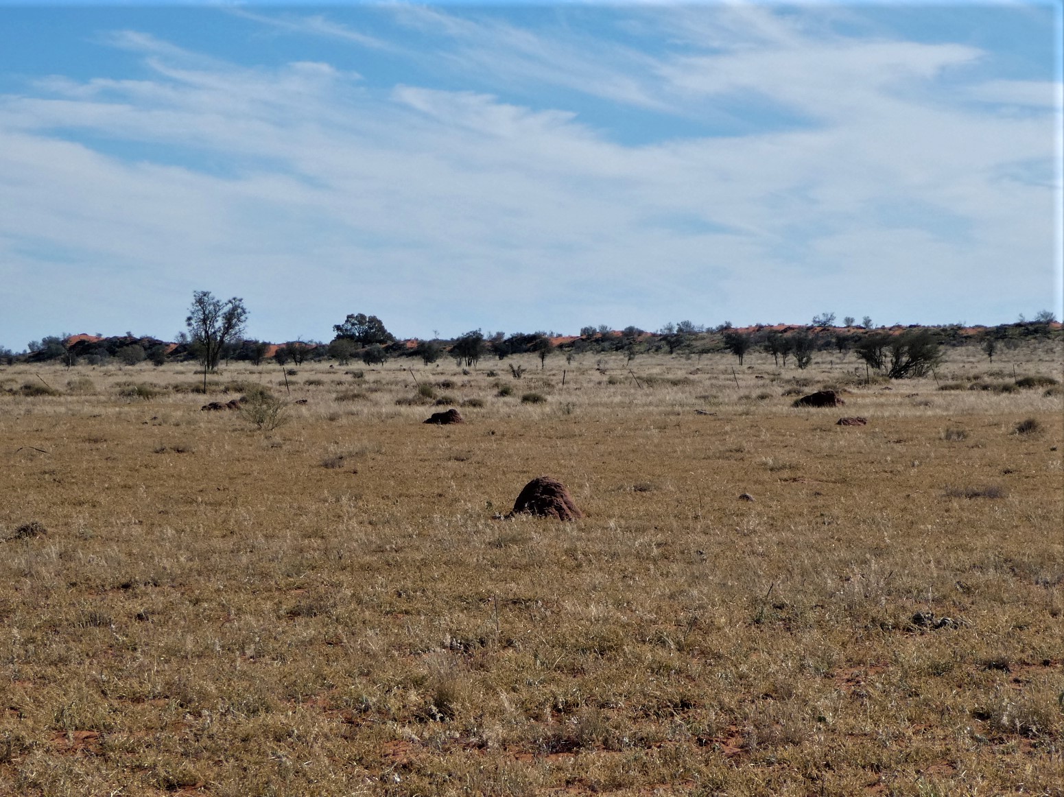 and Liz back on board after shutting the gate, we drove along the access track, from which we could see the long ridge of another dune beyond the termite mounds of this grazing paddock